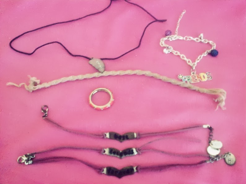 Sempre dei valor a pequenas coisas. Gosto mais que me dêem pequenas coisas mas que estejam repletas de simbolismo e me façam recordar aquelas pessoas para sempre do que presentes espalhafatosos e que passado uns tempos percam todo o significado. E é por isso que ando sempre com estas pulseiras, com o colar e com o anel na minha carteira. São muito importantes para mim, é um elo que tenho com as minhas melhores amigas. Sei que as levo comigo para qualquer lado. E a brincar a brincar, quando me sinto mais em baixo agarro-me a isto e sinto a força delas!